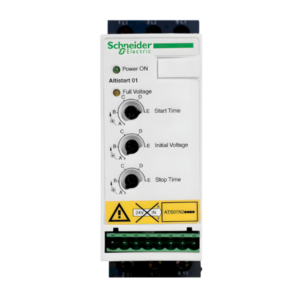 Arrancador suave Schneider Electric – Arrancador suave ATS01 para motores trifásicos de 11kW/15HP (22A), operando a 380VCA. Tensión de comando de 220VCA. Incluye 2 entradas y 2 salidas digitales (incluye Salida Failure). Posee Bypass integrado y admite conexión en triángulo interno. Sin puertos de comunicación.