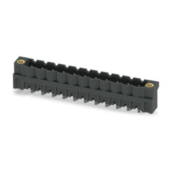 Conectores PCB, sección transversal nominal: 2,5 mm² , color: negro, corriente nominal: 12 A, tensión nominal (III/2): 320 V, superficie de contacto: Sn, tipo de conexión de contacto: Pin, número de potenciales: 11, número de filas: 1, número de posiciones: 11, número de conexiones: 11, gama de productos: CCV 2,5/..-GF-LR, paso: 5,08 mm, montaje: soldadura THR / soldadura por ola, disposición de pines: pines lineales, pin de soldadura [P]: 2,6 mm, número de pines de soldadura por potencial: 1, sistema de conexión: COMBICON MSTB 2,5, alineación del patrón del conector de pines: estándar, bloqueo: sistema de bloqueo y liberación, método de montaje: brida roscada de bloqueo y liberación, tipo de embalaje: embalado en cartón.