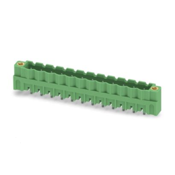 Conectores PCB, sección transversal nominal: 2,5 mm² , color: verde, corriente nominal: 12 A, tensión nominal (III/2): 320 V, superficie de contacto: Sn, tipo de conexión de contacto: Pin, número de potenciales: 12, número de filas: 1, número de posiciones: 12, número de conexiones: 12, gama de productos: CCV 2,5/..-GF, paso: 5,08 mm, montaje: soldadura THR / soldadura por ola, disposición de pines: pines lineales, pin de soldadura [P]: 2,6 mm, número de pines de soldadura por potencial: 1, sistema de conexión: COMBICON MSTB 2,5, alineación del patrón del conector de pines: estándar, bloqueo: mecanismo de bloqueo de tornillo, método de montaje: brida roscada, tipo de embalaje: cinta de 88 mm de ancho.