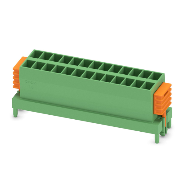 Conector directo para PCB, sección transversal nominal: 2,5 mm² , color: verde, corriente nominal: 12 A, tensión nominal (III/2): 320 V, número de potenciales: 26, número de filas: 2, número de posiciones: 13, número de conexiones: 26, gama de productos: CDDC 2,5/..-PV, paso: 5 mm, método de conexión: conexión por crimpado, montaje: SKEDD – tecnología de conexión directa, dirección de conexión conductor/PCB: 90°, sistema de conexión: SKEDD, bloqueo: bloqueo a presión, método de montaje: brida de cierre, tipo de embalaje: embalado en cartón.