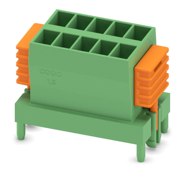 Conector directo para PCB, sección transversal nominal: 2,5 mm² , color: verde, corriente nominal: 12 A, tensión nominal (III/2): 320 V, número de potenciales: 10, número de filas: 2, número de posiciones: 5, número de conexiones: 10, gama de productos: CDDC 2,5/..-PV, paso: 5 mm, método de conexión: conexión por crimpado, montaje: SKEDD – tecnología de conexión directa, dirección de conexión conductor/PCB: 90°, disposición de pines: pines lineales, sistema de conexión: SKEDD, bloqueo: bloqueo a presión, método de montaje: brida de cierre, tipo de embalaje: embalado en cartón.
