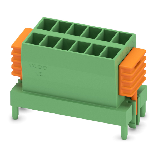 Conector directo para PCB, sección transversal nominal: 2,5 mm² , color: verde, corriente nominal: 12 A, tensión nominal (III/2): 320 V, número de potenciales: 12, número de filas: 2, número de posiciones: 6, número de conexiones: 12, gama de productos: CDDC 2,5/..-PV, paso: 5 mm, método de conexión: conexión por crimpado, montaje: SKEDD – tecnología de conexión directa, dirección de conexión conductor/PCB: 90°, disposición de pines: pines lineales, sistema de conexión: SKEDD, bloqueo: bloqueo a presión, método de montaje: brida de cierre, tipo de embalaje: embalado en cartón.