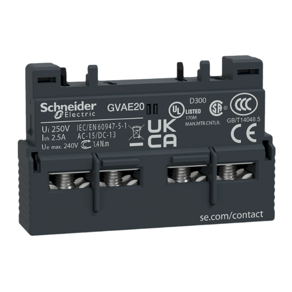Contacto auxiliar frontal Schneider Electric – Bloque auxiliar con 2 contactos normalmente abiertos (NA), con conexión por tornillo. Compatible con contactores y guardamotores TeSys GV2 y TeSys GV3.