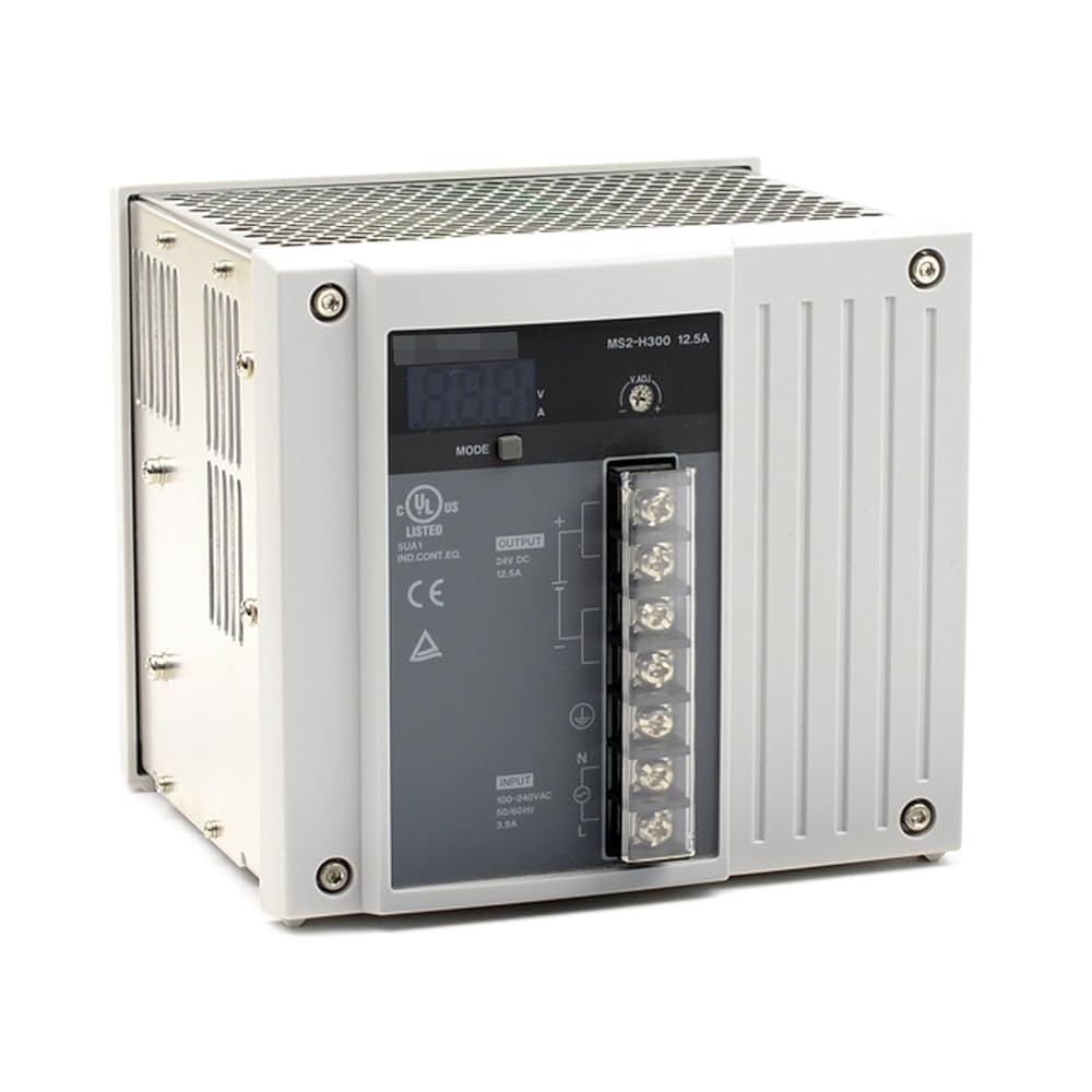 Fuente de alimentación conmutada compacta. Entrada: 100–240 VCA, 50/60 Hz. Salida: 24 VCC, 12,5 A (300 W). Eficiencia: 82–85% (con carga del 100%). Corriente de fuga: 0,4 mA (máx.) a 100 VCA. Tiempo de estabilización: 500 ms (máx.) a temperatura ambiente de 0 a 55 °C bajo condiciones de entrada/salida nominales. Tiempo de arranque: 20 ms (mín.) a temperatura ambiente de 25 °C bajo condiciones de entrada/salida nominales. Ajuste de voltaje: ±5% con el control de voltaje (V.ADJ). Aceleración máxima: 300 m/s² en las direcciones X, Y y Z, dos veces respectivamente. Temperatura ambiente de operación: -10 a +55 °C, sin condensación. Humedad relativa de operación: 25–85%, sin condensación. Materiales: Carcasa de metal fundido a presión con base óptica asférica. Peso: Aproximadamente 3,4 kg.
