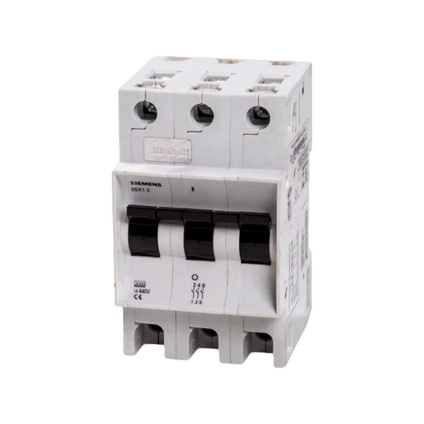 Termomagnética Siemens – Interruptor termomagnético de 3 polos y 2A, curva C, con un poder de corte de 3kA. Opera a 380VCA o 60VCC por polo, brindando protección contra sobrecargas y cortocircuitos.