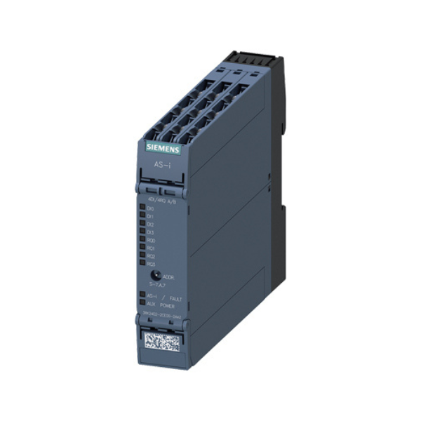 Módulo AS-i SlimLine Compact SC22.5 digital, esclavo A/B 4 DI/4 RQ, IP20 4 entradas para sensor de 3 hilos Alimentación del sensor conmutable 4 relés de salida 1 A 24 V CC Terminales de tornillo Ancho 22,5 mm