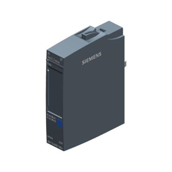 Módulo Siemens – Diseñado para ET200SP y S7-1500SP con 4 entradas analógicas de 16 bits para señales de voltaje 0-10V y corriente 4-20mA en conexión a 2 hilos. Funciona con tensión nominal de 24VCC, se monta en riel DIN y se acopla lateralmente sobre base de distribución de bus mediante conectores frontales de alimentación y distribución.