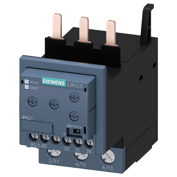 relé de vigilancia, adosable a contactor 3RT2, Tamaño S2 Basic, ajuste analógico vigilancia de corriente aparente 8…80 A, 50…60 Hz, 2 fases Alimentación 24-240 V AC/DC 1 conmutado Vigilancia de rebase por exceso o defecto de la intensidad pérdida de fase, rotura de hilo con o sin memoria de fallos Retardo de arranque 0-60 s Supresión de picos perturbadores 0-30 s Histéresis de conmutación 6 % sistema de conexión por tornillo