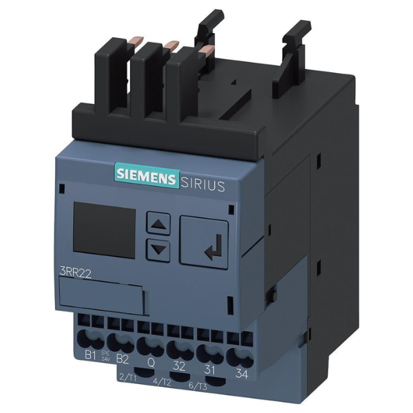 relé de vigilancia, adosable a contactor 3RT2, Tamaño S00 Standard, ajuste digital Vigilancia de corriente aparente/activa 1,6-16 A, 20-400 Hz, trifásico Alimentación 24-240 V AC/DC 1 conmutado, 1 salida estática para alarmas y advertencias Vigilancia de rebase por exceso o defecto de la intensidad pérdida de fase, rotura de hilo secuencia de fases corriente de defecto corriente de bloqueo Advertencia y umbrales de alarma con o sin memoria de fallos Retardo de arranque 0-99 s Supresión de picos perturbadores 0-30 s Pausa tras error 0-300 min bornes de(*)
