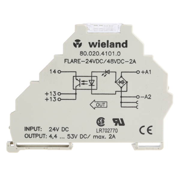 FLARE-24VDC/48VDC-2A. Relé borne de estado sólido 1 inversor. Tensión de mando: 24 V DC. Tensión de salida: 4,4 -53 V DC/2 A. Marca Wieland