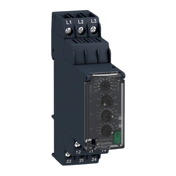 Relé Schneider Electric – Este relé de protección de tensión está diseñado para sistemas trifásicos, con un rango de monitoreo de 304-576 VCA. Proporciona protección contra falta de fase, secuencia de fase incorrecta, subtensión y sobretensión. Cuenta con 2 contactos auxiliares (2 CO) para señalización o control.