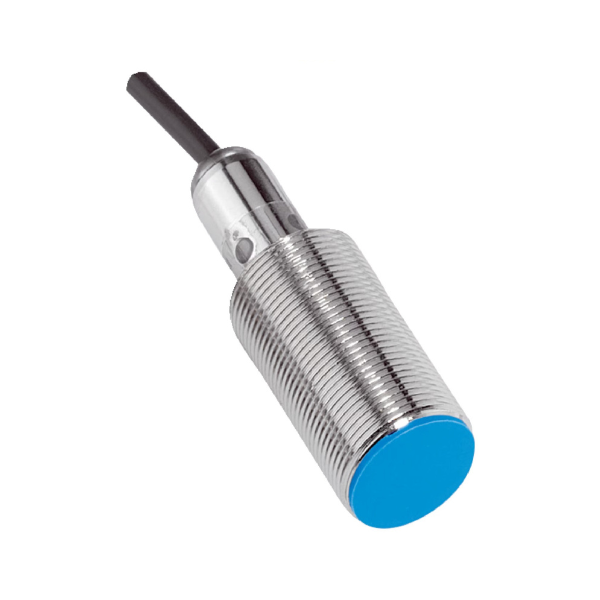 Sensor de proximidad inductivo, carcasa métrica M18 corta, alcance de detección 8 mm, salida PNP (NO), cable 3 hilos de 2 m, IP67, temperatura -25 °C a +75 °C.