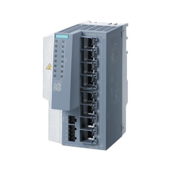 SCALANCE XCM108PoE (8×100/1000 Mbit/s RJ45, PoE) IE Switch no gestionado hasta 120 W de potencia PoE en 8 puertos, diagnóstico por LED, contacto de señalización de errores con pulsador configurado, fuente de alimentación redundante, manual disponible para descarga.