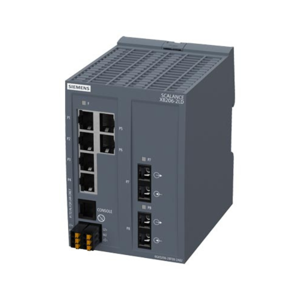 SCALANCE XB206-2LD Managed Layer 2 IE Switch 6 puertos RJ45 de 10/100 Mbps 2 puertos SM FO SC 1 puerto de consola, LED de diagnóstico fuente de alimentación redundante; certificado IEC 62443-4-2; rango de temperatura de 0 °C a +60 °C; montaje en carril DIN; PROFINET predeterminado.